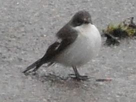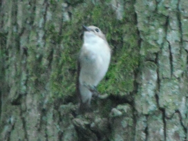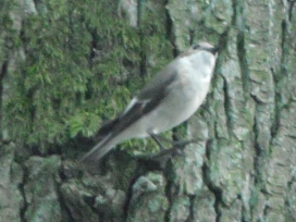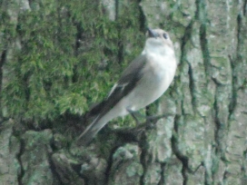 Grauschnäpper (oder Grauer Fliegenschnäpper), lat. Muscicapa striata, unterhalb dieser Zeilen (erste Brut; „Gastvogelfamilie“; Aufnahme: ”X”.: Auch bei diesen Fotos ist jede weitere Verbreitung, Vervielfältigung, Verwertung in welcher und / oder durch welche Art und / oder Weise auch immer ist untersagt.