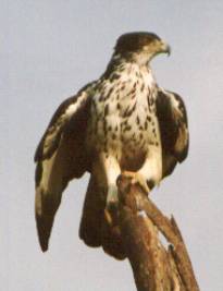 17. Akazienadler (oder Afrikanischer Habichtsadler) Die Akazienadler leben in den bewaldeten Gebieten, Savannen mit Bäumen, den Waldrändern, Regenwaldrändern, Buschlandschaften, offenen Wäldern, in bis zu 3000m Höhe (Ferguson-Lees, Christie: „Die Greifvögel der Welt“ (2009)). Als Verbreitungsgebiet findet man Afrika („Grzimeks Tierleben, Enzyklopädie des Tierreichs“, Band 7 (Vögel 1); Everett: „Raubvögel der Welt“ (1978)) oder Afrika, südlich der „Sahara bis Kapland“ (Weick, Brown: „Die Greifvögel der Welt“ (1980)) oder Mittel- und Südafrika (Dr. Makatsch: „Die Eier der Vögel Europas“ (Band 1), 1974) oder Afrika, südlich der Sahara (Gensböl/Thiede: „Greifvögel“ (2005); „Die Natur: Visuelle Enzyklopädie …..“, 2010; VÖGEL 01/2018) oder Nordostnamibia, Nordbotswana, Simbabwe, Nordtransvaal (Wisniewski: „Tier- und Pflanzenführer, Südliches Afrika“ (2006)) oder Senegambien, Elfenbeinküste, bis Eritrea, Nordsomalia, bis Ostafrika, Angola, Süd-DR-Kongo, bis Nordost-Südafrika, Swasiland (Ferguson-Lees, Christie: „Die Greifvögel der Welt“ (2009)) oder „Ost- und Südafrika“ (Mebs: „Greifvögel Europas“ (2012)) oder Subsahara, ausgenommen der Regenwälder, der Äthiopischen Hochgebirge, der Somalischen Wüsten und Südafrika (Clark, Davies: „African Raptors“ (2018)). Die Oberseite ist schwarz (Wisniewski: „Tier- und Pflanzenführer, Südliches Afrika“ (2006)) oder schwärzlich (Gosler: „Die Vögel der Welt“) oder „schwarz, weiss gefleckt“ (Ferguson-Lees, Christie: „Die Greifvögel der Welt“ (2009)). Die weisse Unterseite besitzt „tropfenförmige Flecken“ (Ferguson-Lees, Christie: „Die Greifvögel der Welt“ (2009)) oder schmale schwarze Streifen (Wisniewski: „Tier- und Pflanzenführer, Südliches Afrika“ (2006)) oder hat kurze dunkle Strichel auf der Brust (Gosler: „Die Vögel der Welt“). Die Grösse beträgt 56 bis 79cm (Weick, Brown: „Die Greifvögel der Welt“ (1980)) oder 55 bis 62cm (Ferguson-Lees, Christie: „Die Greifvögel der Welt“ (2009)) oder 53 bis 66cm (Clark, Davies: „African Raptors“ (2018)) oder 55 bis 65cm („Die Natur: Visuelle Enzyklopädie …..“, 2010) oder 60 bis 70cm (Gosler: „Die Vögel der Welt“; Wisniewski: „Tier- und Pflanzenführer, Südliches Afrika“ (2006)). Die Akazienadler jagen Beutetiere, die z.T. schwere und grösser sind als sie selbst. Das Weibchen legt 2 Eier. Es werden 1 bis 2 Jungvögel (Clark, Davies: „African Raptors“ (2018)) grossgezogen. |