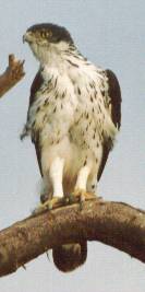 16. Schwarzachseladler (oder Afrikanischer Haubenadler) Die Schwarzachseladler sind in den tropischen Wäldern, dichten Wäldern, in bis zu 2300m Höhe verbreitet. Als Verbreitungsgebiet findet man Afrika (Gefiederte Welt 05/2001) oder Westafrika und die Wälder Kongos (Lloyd/Lloyd: „Greifvögel und Eulen“ (1980)) oder Westafrika, „Kongo bis Uganda (Bwamba), Gabun bis Togoland“, „Zaire (Katanga bis Uele)“ (Weick, Brown: „Die Greifvögel der Welt“ (1980)) oder im Norden von DR Kongo, Nordangolas, Sierra Leone bis Westuganda bis VR Kongo (Ferguson-Lees, Christie: „Die Greifvögel der Welt“ (2009)) oder Guinea, bis Liberia, bis Togo, im Kongobecken, Nigeria, Westuganda, Westtansania, Nordwestangola, auch in Kenia (als Aquila africana aufgeführt bei: Clark, Davies: „African Raptors“ (2018)) verbreitet. Die Oberseite ist „schwarz“ (Lloyd/Lloyd: „Greifvögel und Eulen“ (1980)) oder „schwärzlich“ (Ferguson-Lees, Christie: „Die Greifvögel der Welt“ (2009)). Der Schwarzachseladler hat keine Haube (Lloyd/Lloyd: „Greifvögel und Eulen“ (1980)). Der Schwanz ist gebändert (Ferguson-Lees, Christie: „Die Greifvögel der Welt“ (2009)). Die Unterseite ist „weiss“ (Lloyd/Lloyd: „Greifvögel und Eulen“ (1980)) oder „weiss”, wobei jedoch die Brustseiten, die Flanken und die äusseren Hosen „schwarz gefleckt” sind (Ferguson-Lees, Christie: „Die Greifvögel der Welt“ (2009)). Die Grösse beträgt 56 bis 61cm (Weick, Brown: „Die Greifvögel der Welt“ (1980); Lloyd/Lloyd: „Greifvögel und Eulen“ (1980)) oder 50 bis 56cm (Ferguson-Lees, Christie: „Die Greifvögel der Welt“ (2009)) oder 50 bis 58cm (als Aquila africana aufgeführt bei: Clark, Davies: „African Raptors“ (2018)) oder 60cm („Grzimeks Tierleben, Enzyklopädie des Tierreichs“, Band 7 (Vögel 1)). Zur Nahrung zählen Vögel und Säugetiere (Hörnchen). |