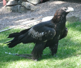 12. Keilschwanzadler Die Keilschwanzadler sind seit 35.000 Jahren nachweisbar (Greifvögel und Falknerei 2009/2010) und werden aufgrund der „Massenvernichtung seitens des Menschen (Schafzüchter) von der völligen Vernichtung bedroht“ („Das moderne Tierlexikon (in zwölf Bänden)“, 1981) oder werden von den Farmern „trotz Artenschutz extrem verfolgt“, weil sie mitunter Lämmer erbeuten (Adlerwarte Berlebeck: Zooschild) oder wurden aufgrund der angeblichen Tötung von Schafen als „Schädlinge“ eingestuft, so dass 120.000 Keilschwanzadler „zwischen 1950 bis 1959“ abgeschossen oder vergiftet wurden (Olsen: "Adler und Geier, Grosstiere der Welt" (1991)) oder in „20 Jahren“ wurden 94.000 Keilschwanzadler sinnlos dahingemordet („Urania Tierreich, Band Vögel“ (1995)) oder aufgrund einer Prämie von 2 Schilling, zuletzt 5 Schilling wurden in den Jahren 1928 bis 1948 „vor allem aus dem Kimberly-Bezirk“ 94.090 Keilschwanzadler getötet („Grzimeks Tierleben, Enzyklopädie des Tierreichs“, Band 7 (Vögel 1)) oder im Südosten Australiens „im australischen Bundesstaat Victoria“ wurden „mindestens 136 geschützte“ Keilschwanzadler tot aufgefunden, deren Tod „absichtlich herbeigeführt worden“ war (ÖFB Newsletter (06/2018)). Andererseits findet man auch, dass Keilschwanzadler kranke oder verendete Lämmer fressen (Felix: „Die Tiere Australiens“), wobei man dann auch findet, dass „jedes Schaf, das“ Keilschwanzadler fressen, „vermutlich bereits tot“ war („Grosses Lexikon der Tiere“, Band 1, (1989)). Die Keilschwanzadler leben in den Savannen, Wüsten, offenen Wäldern, Waldrändern, offenen Bergwäldern, Halbwüsten, buschbestandene Gegenden, offenen Landschaften, Parklandschaften. Reviergrössen von durchschnittlich 20km² bzw. „31,08 bis 33,22km²“ bzw. „42- 44km²“ (Fischer: „Stein-, Kaffern- und Keilschwanzadler“, NBB500 (1995)) werden angegeben. Als Verbreitungsgebiet wird allgemein Australien (Everett: „Raubvögel der Welt“ (1978); Adlerwarte Berlebeck: Zooschild) oder Australien, Tasmanien und südliches Neuguinea („Lebendige Wildnis, Tiere der Taiga“ (1993); Perrins: „Die grosse Enzyklopädie der Vögel“; Felix: „Die Tiere Australiens“; Robiller: „Lexikon der Vogelhaltung“ (1986)) oder Australien und der Süden Neuguineas (Olsen: "Adler und Geier, Grosstiere der Welt" (1991)) oder „Australien und Neuguinea“ (Gosler: „Die Vögel der Welt“) oder „Australien und Tasmanien“ (Lloyd/Lloyd: „Greifvögel und Eulen“ (1980)) oder Australien, Tasmanien, Neuguinea (Hanzak: "Das große Bilderlexikon der Vögel" (1965)) oder Australien und als Irrgast in Neuguinea (Weick, Brown: „Die Greifvögel der Welt“ (1980)) angegeben. Genaugenommen ist die Unterart Aquila audax audax (Latham, 1801) in Australien und Süd-Neuguinea (Fischer: „Stein-, Kaffern- und Keilschwanzadler“, NBB500 (1995); Barthel, Barthel, Bezzel, Eckhoff, van der Elzen, Hinkelmann, Steinheimer: „Die Vögel der Erde – Arten, Unterarten, Verbreitung und deutsche Namen“, 2021) oder in Australien und Südzentral-Neuguinea (Ferguson-Lees, Christie: „Die Greifvögel der Welt“ (2009)). Die Unterart Aquila audax fleayi (Condon & Amadon, 1954) in Tasmanien (Fischer: „Stein-, Kaffern- und Keilschwanzadler“, NBB500 (1995); Ferguson-Lees, Christie: „Die Greifvögel der Welt“ (2009); Barthel, Barthel, Bezzel, Eckhoff, van der Elzen, Hinkelmann, Steinheimer: „Die Vögel der Erde – Arten, Unterarten, Verbreitung und deutsche Namen“, 2021) verbreitet. Die tasmanische Unterart ist aufgrund der Lebensraumzerstörung und Verfolgung bedroht (Perrins: „Die grosse Enzyklopädie der Vögel“). Das Gefieder ist allgemein „dunkelbraun“ („Vögel, Die grosse Bild-Enzyklopädie“ (2008); Fehling: „Australien; Natur-Reiseführer“, (2003)) oder „braunschwarz“ („Grzimeks Tierleben, Enzyklopädie des Tierreichs“, Band 7 (Vögel 1)) oder „dunkelbraun bis schwarz“ (Robiller: „Lexikon der Vogelhaltung“ (1986)) oder schwärzlich und braun (Lloyd/Lloyd: „Greifvögel und Eulen“ (1980)) oder russschwarz mit gelbbraunem Nacken (Simpson, Day: „Birds of Australia“, (2012)) oder russschwarz mit gelbbraunem Nacken, gesprenkelter Flügeloberseite „mit einem gelbbraunen Streifen“ (Gosler: „Die Vögel der Welt“) oder schwärzlich mit rotbraunem Nacken („Lebendige Wildnis, Tiere der Taiga“ (1993)). Die Nackenfedern können aufgestellt werden (Fischer: „Stein-, Kaffern- und Keilschwanzadler“, NBB500 (1995)). Genaugenommen ist das Gefieder bei der Unterart Aquila audax audax „vorwiegend schwarz … mit bräunlichem Nacken“ oder „glänzend braunschwarz, nur die Lanzettfedern des Nackens und die Spitzen der kleinen Flügeldecken sowie die Unterschwanzdecken sind in braunrötlicher“ oder rötlicher bzw. „im Alter nur noch dunkelrotbrauner Farbe abgesetzt“ (Fischer: „Stein-, Kaffern- und Keilschwanzadler“, NBB, Band 500, 1995) oder „schwärzlich glänzend“ mit beige-farbenen Nackenfedern (Ferguson-Lees, Christie: „Die Greifvögel der Welt“ (2009)). Genaugenommen besitzt das Gefieder der Unterart Aquila audax fleayi einen helleren Nackenfleck (Weick, Brown: „Die Greifvögel der Welt“ (1980)) oder „einen >blassen<, lichtbraunen bis weisslichen Nacken“ (Fischer: „Stein-, Kaffern- und Keilschwanzadler“, NBB, Band 500, 1995) oder einen beige-farbenen Nacken (Ferguson-Lees, Christie: „Die Greifvögel der Welt“ (2009)). Die Augen sind braun (Fischer: „Stein-, Kaffern- und Keilschwanzadler“, NBB500 (1995)). Die Grösse beträgt 81 bis 104cm (Dierschke: „1000 Vögel“) oder 86 bis 102cm (Weick, Brown: „Die Greifvögel der Welt“ (1980); Lloyd/Lloyd: „Greifvögel und Eulen“ (1980)) oder 102cm (Rheinwald: „Atlas der Vogelwelt“ (1994)) oder 84 bis 104cm (Perrins: „Die grosse Enzyklopädie der Vögel“) oder 85 bis 105cm (Simpson, Day: „Birds of Australi