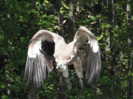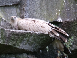 05. Schneegeier (oder Himalajageier) Die Schneegeier sind am Himalaja und anderen Gebirgen „Mittelasiens“ („Lebendige Wildnis, Tiere der Baumsavanne“ (1995)) oder im Himalaja (Barthel, Barthel, Bezzel, Eckhoff, van der Elzen, Hinkelmann, Steinheimer: „Die Vögel der Erde – Arten, Unterarten, Verbreitung und deutsche Namen“, 2021) oder im Himalajagebiet und den angrenzenden „Gebirge bis zum Altai“ (Tierpark Berlin 2024: Tierparkschild: „Schneegeier“) oder in Innerasien (Blaszkiewitz: „Tierpark Berlin; Wegweiser durch den Tierpark“, (2012 (48. Aufl.); 2013 (49.Aufl.); „Greifvögel und Falknerei“ (2018)) oder „im Hochgebirge bis in 6000m oder vielleicht sogar noch höher“ ("Königreich der Tiere von A-Z", Bd. 5 (1981)) oder in den Gebirgsmassiven Asiens (Bayerischer Jagdfalkenhof Schloss Tambach: Zooschild: Schneegeier) oder in „Bhutan, Afghanistan, Pamir, Tibet“, Nordindien (Robiller: „Lexikon der Vogelhaltung“ (1986)) oder „Himalaja bis Bhutan und Afghanistan”, Tibet, „Berge Zentralasiens bis zum Gobi-Altai und seinen Ausläufern”, Tarbagatai, Tienschan, „Pamir, Sikang bis zum Qinghai”, Gebirge der Mongolei, Hochgebirge Tibets (Fischer: „Die Geier“, NBB 311 (2005)) oder „Bergregionen Zentralasiens von Afghanistan und Tibel bis Buthan, Sikiang und Kuku-Nor von China“ (Burgfalknerei Hohenbeilstein: Zooschild (TUKAN-Zooschild: Schneegeier)) oder Tien-Schan, Tibet, Himalaya (Tierpark Berlin Friedrichsfelde: Zooschild (Tierpark-Zooschild: Schneegeier)) oder in Zentralasien bis Nordindien (Ferguson-Lees/Christie: “Die Greifvögel der Welt” (2009)) verbreitet. Die Schneegeier sind einerseits Standvögel im Himalaya, andererseits über den Winter in den Prärien Nordindiens anzutreffen (Grimmett, Inskipp, Inskipp: „Birds of the Indien Subcontinent“ (2015)). Die Schneegeier leben „in den Hochgebirgen“ „unter extremen Witterungsunbilden, Kältebelastungen (bis um -50°C)“ („Greifvögel und Falknerei“ (2018)). Mitunter kreisen die Schneegeier „stundenlang“ „in der Luft“ auf der Such nach Beute (Burgfalknerei Hohenbeilstein: Zooschild (TUKAN-Zooschild: Schneegeier)). Zum Schneegeier werden in Nepal zur Brutseason 2018-2019 71 Bruten und davon 56 erfolgreiche Bruten („Report of 9th Annual Meeting of Saving Asia’s Vultures from Extinction“) angegeben. Aufgrund einer Zählung in 32 Distrikten Nepals am 7. September 2019 (Internationaler Geierjahrestag oder Welt-Geier-Tag (International Vulture Awareness Day)) dokumentierte man 369 Schneegeier („Report of 9th Annual Meeting of Saving Asia’s Vultures from Extinction“). In Nepal wurden im Zeitraum 2020 bis 2021 in 12 Distriken 500 Geiernester überwacht, wobei 345 erfolgreiche Bruten mit einem Kücken und 156 nicht erfolgreiche Bruten dokumentiert wurden und man konnte bei den 62 Schneegeiernestern 36 erfolgreiche Bruten dokumentiern („11th Annual SAVE Report“, save asia's vulture from extinction, S.43). In Bangladesh wurden im Zeitraum 2023 bis 2024 22 rehabilitierte Schneegeier ausgewildert („saving asia's vulture from extinction, 2023 Summary Report...) Der Kopf und der Hals sind „weiss bedunt“ (Robiller: „Lexikon der Vogelhaltung“ (1986)) oder der Kopf und der Hals sind „flaumig befiedert“ (Tierpark Berlin Friedrichsfelde: Zooschild (Tierpark-Zooschild: Schneegeier)). Die Halskrause ist „cremefarben bis bräunlich mit weissen Schäften“ (Ferguson-Lees/Christie: “Die Greifvögel der Welt” (2009)) oder schmutzigweiss (Fischer: „Die Geier“, NBB 311 (2005)) und hat die „Funktion einer Art Serviette“, die Verunreinigungen des Gefieders durch das Aas verhindern soll (Veselovsky: „Illustriertes Lexikon der Vögel“ (1998)). Allgemein ist das Gefieder ist „rahmfarben bis hellbraun“ (Robiller: „Lexikon der Vogelhaltung“ (1986)) oder schmutzigweiss (Tierpark Berlin Friedrichsfelde: Zooschild (Tierpark-Zooschild: Schneegeier)) oder heller“ als beim Gänsegeier („Das moderne Tierlexikon (in zwölf Bänden)“ Band 4 (Geb-Heri)). Der Schwanz ist „dunkelbraun“ (Robiller: „Lexikon der Vogelhaltung“ (1986)). Genaugenommen ist die Oberseite „hell sandfarben bis gelblich weiss“ (Ferguson-Lees/Christie: “Die Greifvögel der Welt” (2009)) oder “bräunlich-rahmfarben und etwas ungleichmässig dunkel gezeichnet” (Fischer: „Die Geier“, NBB 311 (2005)). Der Unterrücken ist weiss (Weick: Die Greifvögel der Welt“, (1980)) oder der Hinterrücken ist weiss (Tierpark Berlin Friedrichsfelde: Zooschild (Tierpark-Zooschild: Schneegeier)). Die Oberflügeldecken sind „weiss bis lichtbeige“ (Weick: Die Greifvögel der Welt“, (1980)) oder „weiss bis rahmfarben“ (Fischer: „Die Geier“, NBB 311 (2005)). Die Armschwingen sind „dunkelbraun“ und die Handschwingen „schwarz“ (Robiller: „Lexikon der Vogelhaltung“ (1986)) oder die Armschwingen sind „bräunlichschwarz“ und die Handschwingen „ganz schwarz“ (Fischer: „Die Geier“, NBB 311 (2005)). Genaugenommen ist auch die Unterseite „cremefarben bis bräunlich mit weissen Schäften“ (Ferguson-Lees/Christie: “Die Greifvögel der Welt” (2009)) oder „nicht selten weiss“ („Das moderne Tierlexikon (in zwölf Bänden)“ Band 4 (Geb-Heri)) oder „hell-fahlbraun bis rahmfarben“ mit breiten weisslichen Längsstreifen (Fischer: „Die Geier“, NBB 311 (2005)). Die Grösse beträgt 90cm („Lebendige Wildnis, Tiere der Baumsavanne“ (1995)) oder 120cm ("Königreich der Tiere von A-Z", Bd. 5 (1981)) oder 103 bis 110cm (Ferguson-Lees/Christie: “Die Greifvögel der Welt” (2009)) oder 104 bis 109cm (Weick: Die Greifvögel der Welt“, (1980); Lloyd/Lloyd: „Greifvögel und Eulen“ (1980)) oder 105 bis 120cm (Bayerischer Jagdfalkenhof Schloss Tambach: Zooschild: Schneegeier) oder 110 bis 120cm (Baumgart: „Europas Geier“) oder 115 bis 125cm (Grimmett, Inskipp, Inskipp: „Birds of the Indien Subcontinent“ (2015)). Die Aug