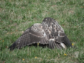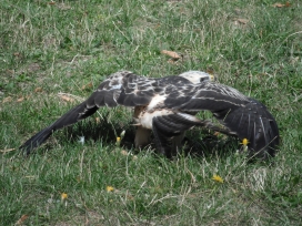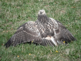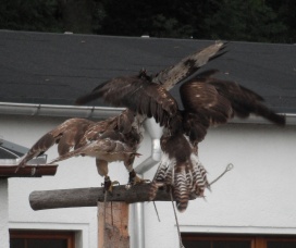 Andererseits legt sich ein im Streit unterlegener Mäusebussard reglos „zum Zeichen der Unterwerfung” auf die „Seite und hebt einen Flügel an” („Faszination Tier & Natur“ (Loseblatt-Sammelwerk)) bzw. ein im Streit unterlegener Mäusebussard legt sich mit dem Rücken auf den Boden und breitet die Flügel aus (Haseder, Stinglwagner: „Knaurs Grosses Jagdlexikon“, 2000; Foto: Seite 143). Auch im Sommer konnte ein Streit zweier Mäusebussarde, die sich um ein Ei streiteten (FALKE 08/2015), dokumentiert werden. Beide Mäusebussarde haben sich zuerst „mit gesträubten Nackengefieder und ausgebreiteten Flügeln“ gegenseitig bedroht (FALKE 08/2015). Nachdem einer der Mäusebussarde den anderen Mäusebussard mit einer Schwinge niederschlug, streckte der unterlegene auf dem Rücken liegende Mäusebussard die Fänge zur Abwehr entgegen, hob den linken Flügel und kapitulierte durch Bewegungslosigkeit (FALKE 08/2015). Andererseits ist auch bei der Beuteübergabe einmal beobachtet worden, dass sich das Männchen „mit gespreizten Flügeln” auf den Rücken legt, „um zu zeigen, dass es sein Futter dem überlegenen Weibchen abtritt” („Die faszinierende Welt der Tiere“ (1993); Seite 253).