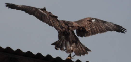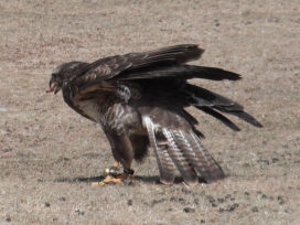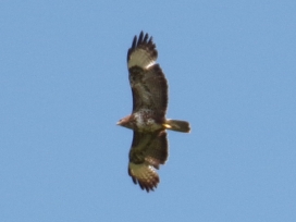 „Ein weisses Feld an der Basis der Hand“ und die dunklen Handwurzelflecken haben alle Mäusebussarde gemeinsam (Thiede: „Greifvögel und Eulen“ (2005); Gensböl/Thiede: „Greifvögel“ (2005)) bzw. alle haben auffällig helle „Flecken an der Handschwingenbasis“ (Beaman/Madge: „Handbuch der Vogelbestimmung, Europa und Westpaläarktis“ (1998/2007)). Die Spitzen der Handschwingen sind schwarz (FALKE 01/2014).