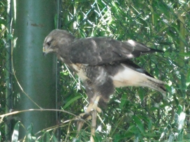 Der Schwanz ist dunkel gebändert (Pielowski: „Die Greifvögel“ (1993); Pott: „Das grosse Ravensburger Tierlexikon von A-Z“ (2002)) oder ist immer gebändert (Franz Robiller: „Lexikon der Vogelhaltung“ (1986)) oder ist meist „eng und nicht sehr deutlich gebändert“ (Heinzel, Fitter, Parslow: „Pareys Vogelbuch“ (1988)) oder ist eng gebändert (FALKE 01/2014) oder ist „meist eng gebändert“ (Greifvogelpark / Falknerei Katharinenberg: Zooschild) oder hat 5 bis 6 „schmale, dunkle Querbinden“ und eine dunkle Endbinde (Mebs: „Greifvögel Europas“ (2012)) oder ist grau und braun und hat enge Bänder und eine breite dunkle Endbinde („Enzyklopädie Tiere, faszinierend und geheimnisvoll“ (2003)) oder ist „typischerweise“ gräulich „mit vielen schmalen Querbinden und einer markanten, breiten Endbinde versehen“ (Gensböl/Thiede: „Greifvögel“ (2005)) oder ist weisslich und „eng grau gebändert“ (Svensson: „Der Kosmos Vogelführer” (2011)) oder ist „viel heller und mit grauschwarzen Streifen versehen“ (Handrinos/Demetropoulos: „Raubvögel in Griechenland“ (1983)) oder ist schmutzigweiss, dicht gräulich quergebändert und mit einer breiten schwarzen Schwanzendbinde versehen (Heintzenberg: "Greifvögel und Eulen, Alle Arten Europas", 2013 (2.Aufl.)) oder hat eine breite Endbinde und bis zu 10 schmale Querbinden ("LBV-Kompakt Greifvögel") oder hat eine breite Endbinde und 10 bis 12 Querbinden (Zimmer/Eisenreich: „Greifvögel und Eulen sowie Rabenvögel“, (2006)) oder hat 8 bis 12 Querbinden (Melde: „Der Mäusebussard“, NBB185 (1983/2013)).