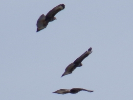 Zurück ins Brutrevier kommen die Mäusebussarde Ende Februar bis Anfang März (Melde: „Der Mäusebussard“, NBB185 (1983/2013)) oder „zwischen Mitte März und Ende April“ (Mebs: „Greifvögel Europas“ (2012)) oder „Indien bis China“ und „Süd- und Ostafrika“ (Brichetti: „Vögel in Garten, Park und freier Natur“ (2002)).