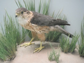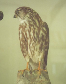 Falco columbarius aesolon: Beim Weibchen ist die Oberseite „dunkelbraun, rötlich gesäumt“ und mit schwarzen Schaftstrichen versehen und die Unterseite ist „weiss bis beige, von der Brust abwärts rötlich getönt, kräftig braun gestreift“ (Ferguson-Lees/Christie: “Die Greifvögel der Welt” (2009)).