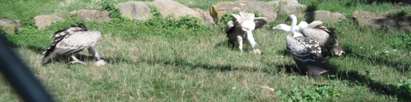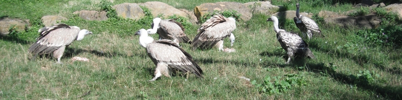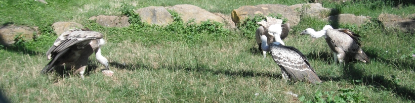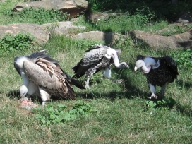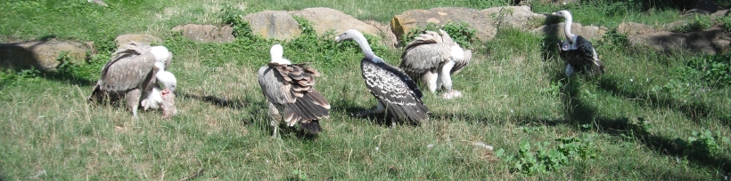 04.02.03. aus der Welt der Geier Am Kadaver finden sich zuerst die Sperbergeier und Weissrückengeier ein und die dann dazukommenden Ohrengeier reissen die Haut des verendeten Tieres auf (Attenborough: „Das geheime Leben der Vögel“) oder sofern der Kadaver „noch nicht aufgerissen ist“, wird der Kadaver vom Ohrengeier geöffnet (Richard, Coomber: „Vögel; Enzyklopädie der Familien und Unterarten“, 1992) oder die Ohrengeier schaffen es mit ihrem kräftigen Schnabel das Fell des Kadavers aufzureisen (Burton: "Das Königreich der Tiere", 1977) oder am Aas öffnen die Ohrengeier die Beute („Vögel, Die grosse Bild-Enzyklopädie“ (2007)) oder die Ohrengeier reisen mit dem „gewaltigen Schnabel zähe Tierhäute und Muskeln“ auf (Dossenbach/Dossenbach: “Das wundervolle Leben der Vögel”) oder am Kadaver erscheinen in Afrika zuerst die niedrig fliegenden Ohrengeier und Wollkopfgeier, wobei die Ohrengeier mit dem „starken Schnabel den Kadaver öffnen“ (Burton: "Das Leben der Vögel" (1985)). Andererseits fanden irische Zoologen mittels 3-D-Aufnahmen heraus, dass Geier „in Kenia Raub- oder Savannenadlern (Aquila rapax) sowie Steppenadlern (A. Nipalensis)“ aufgrund des strengeren Sehfeldes und des schärferen Schnabels den Vorrang lassen und erst danach zum Aas kommen (FALKE 03/2015). Man findet, dass „der Hunger, der sich in einer Reihe von Veränderungen des Stoffwechsels äussert, die sich auf das Nervensystem der Geier auswirken, erzeugt bei diesen Vögeln eine starke Angriffslust”, weshalb „die hungrigsten Geier” einen am Kadaver erobern und ihre Aggressivität mit dem satt werden nachlässt und sich der Stoffwechsel wieder normalisiert (de la Fuente: „fauna Das grosse Buch über das Leben der Tiere“, Band 1 Afrika (1971)). Die Ohrengeier und Wollkopfgeier halten die später hinzukommenden hoch oben kreisenden Weissrückengeier und Sperbergeier „zunächst vom Futter fern“ (Burton: "Das Leben der Vögel" (1985)) oder die Ohrengeier vertreiben „alle anderen Geier vom Aas” und sind „in der Lage, selbst die Kadaver der Grosstiere bis zum Elefanten anzureissen” (Diesselhorst, Fechter: „Knaurs Tierleben von A-Z, Band 2 (M-Z)”, 1981) oder die Ohrengeier vertreiben die Weissrückengeier von Aas (Schmitz: „Tiere in freier Natur“ (1984)) oder nach den Ohrengeiern kommen die Sperbergeier und Weissrückengeier und zum Schluss die Kappengeier und Schmutzgeier an die Reihe (Richard, Coomber: „Vögel; Enzyklopädie der Familien und Unterarten“ (1992)). Man findet, dass die Mönchsgeier sich zuerst am Kadaver bedienen, da die aufgrund des kräftigen Schnabels die Haut aufreissen und die Sehnen zerreissen (FALKE Sonderheft: „Geier“ (2016)) oder dass die Mönchsgeier aufgrund des „kräftigen, grossen Schnabels in der Lage“ sind, „Tierkadaver aufzureisen“ (Zoo Schmiding: Zoo-Zooschild: Mönchsgeier) oder dass die Mönchsgeier den Kadaver öffnen können (WWF-Österreich: „Artenreiches Österreich: Buch der Arten“) oder dass die Mönchsgeier oder Gänsegeier die Kadaver öffnen (Mebs/Schmitt „Die Greifvögel Europas, Nordafrikas und Vorderasiens“ (2006)) oder dass die Mönchsgeier mit dem „gewaltigen Schnabel zähe Tierhäute und Muskeln“ aufreisen und durchtrennen (Dossenbach/Dossenbach: “Das wundervolle Leben der Vögel”) oder dass die Mönchsgeier „als erster der Aas“ zerreisst (Handrinos/Demetropoulos: „Raubvögel in Griechenland“ (1983)). Andererseits findet man auch, dass bei der Aassuche sich auch die Gänsegeier untereinander im Auge behalten, denn sobald einer der Gänsegeier „mit angewinkelten Flügeln im steilen Gleit- oder Spiralenflug zum entdeckten Kadaver” hinunterstürzt, kommen die anderen Gänsegeier dazu (Pielowski: „Die Greifvögel“ (1993)). Für die Suche nach den verendeten Tieren sind die Gänsegeier in über 1.000m Höhe 7 bis 9 Stunden bei „günstigen Wetter- und Sichtverhältnissen“ unterwegs (VÖGEL 01/2017) oder verbringen die Gänsegeier „viel Zeit in der Luft“ („De Agostini: Falcons & Co. Maxxi Edition“: Gänsegeier (2017)). Sobald ein Gänsegeier ein totes Tier entdeckt hat, gleitet der Gänsegeier mit bis zu 160km/h dem Aas entgegen (VÖGEL 01/2017). Gänsegeier landen in einer Entfernung „von bis zu mehreren hundert Metern“ von Aas, „um die Situation vor Ort zu prüfen“ (VÖGEL 01/2017). Der „ranghöchste“ Gänsegeier läuft „in aufrechter Drohhaltung mit einem ausgeprägten Stechschritt und gespreizten Zehen zum Kadaver“, hält die anderen Gänsegeier auf Distanz, weitet oder ritzt die weichen Hautstellen vom Aas, „vor allen die Anal- und Maulöffnung“ auf und beginnt zu fressen (VÖGEL 01/2017) oder man findet auch, dass „zum Aufreissen des Körpers“ „der Gänsegeier seinen scharfen Schnabel“ nutzt (Leipziger Volkszeitung: „Zoo live“: 29.07.2017). Sobald die Bauchdecke geöffnet ist, stützen alle in der Luft noch befindlichen Gänsegeier zum Aas hinab (VÖGEL 01/2017). Die Gänsegeier fauchen, schlagen mit den Flügeln, drohen Schnabelhiebe an, „zeigen den drohenden Stechschritt mit gehobenen Krallen“, sitzen übereinander, liefern tumultartige Szenen „beim Kampf um die Innereien“ (VÖGEL 01/2017). Im „Kampf um die Beute“ halten auch die Schabrackenschakale nach kreisenden Geier Ausschau, deren Kreisen verrät, „dass in der Nähe Aas liegen muss“ und andererseits verfolgen auch die Geier Schabrackenschakale, die „sie direkt zu verborgenen Kadavern führen“ können ("Lebendige Wildnis, Tiere der afrikanischen Savanne" (1992)) oder auch Hyänen und Löwen beobachten die Geier, „um zu dem Punkt zu laufen, den die geflügelten Aasfresser anstrebten” (de la Fuente: „fauna Das grosse Buch über das Leben der Tiere“, Band 1 Afrika (1971)). Sollten sich an dem Kadaver noch Löwen befinden, „müssen die Geier oft tagelang warten“ bis sie an den Kadaver kommen (Fischer: „Die Geier“, NBB 311 (2005)).