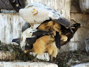 Mit freundlicher Genehmigung von Bettina Boemans, www.geierwelt.blogspot.de, wurden die nachfolgenden Fotos der Kapgeier (links: Sammeln von Nistmaterial; rechts Begattung) in der Brutvoliere bei "VulPro" (Vulture Conservation Programme (Südafrika)), www.vulpro.com, verwendet.