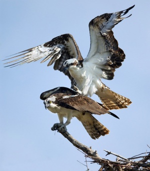 Bei den Wanderfalken wird die 8 bis 15 Sekunden andauernde Begattung, das Weibchen ist in der Waagerechte mit gesträubten Unterschwanzdecken und das Männchen hält sich mit heftigen Flügelschläge auf dem Rücken, mit Rufen begleitet ("Lebendige Wildnis, Tiere der Nadelwälder", 1994).