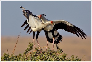Die Schlangenadler führen Balzflüge, die mit lauten Pfeiftönen begleitet sind, nach der Ankunft im Brutgebiet im März durch. Die Gaukler führen im Beizflug "Vorwärtsrollen" durch.