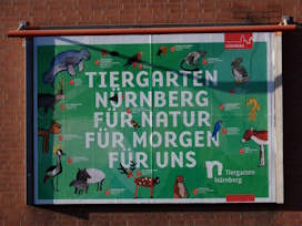 Die nachfolgenden Fotos zeigen vom Tiergarten Nürnberg Werbeplakate (links, mitte) und ein Hausgemälde (rechts)