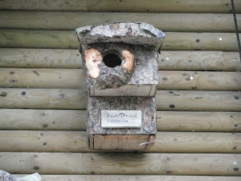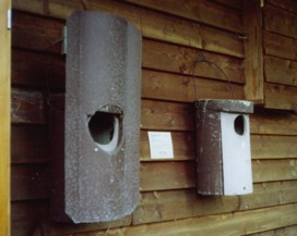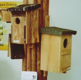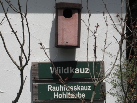 Nistkästenbeispiele für Eulen Sperlingskäuze (aufgenommen im Bayerwald-Tierpark Lohberg (links))