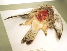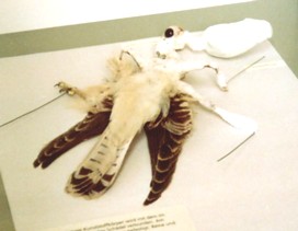 Aus den Arbeitsschritten der Präparation: Entfernung von Fleisch und Fett (links), waschen und die Füllung mit Kunststoff und Glasauge (rechts). Anschliessend werden die Beine und die Flügel mit Drähten fixiert und mehrere Wochen getrocknet.