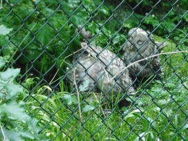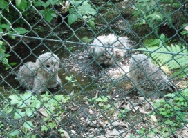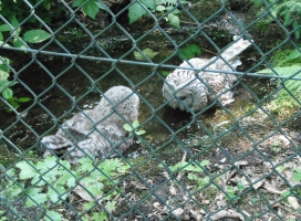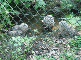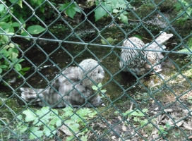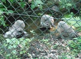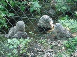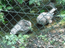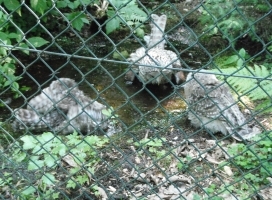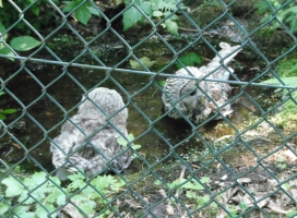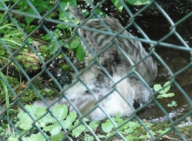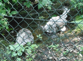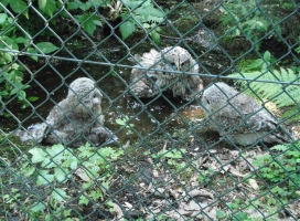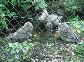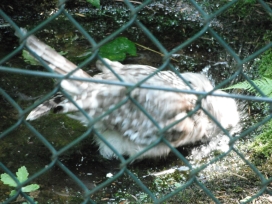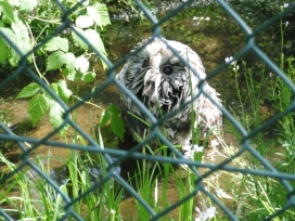 frisch gebadet ... das nasse Gefieder ... rechter Altvogel schüttelt den Kopf (linkes Bild), zeigt den nackten Bauch (Brutfleck); (mittleres, rechtes Bild (vergrössert)) |