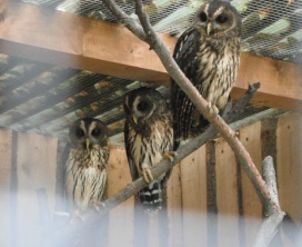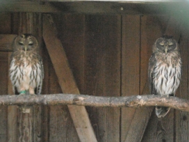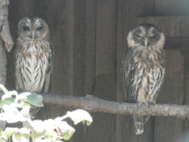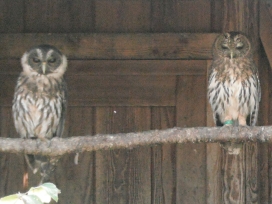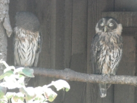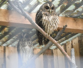 Die Brasilkäuze sind standorttreu (Tierpark Berlin 2024: Tierparkschild: „Brasilkauz“).
