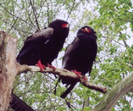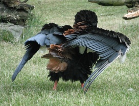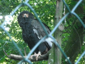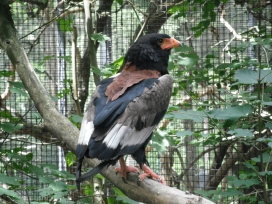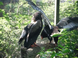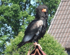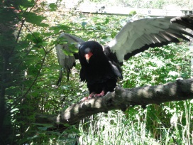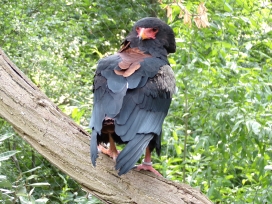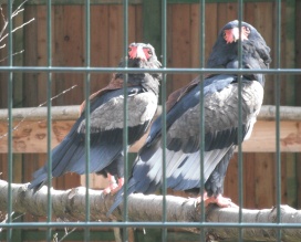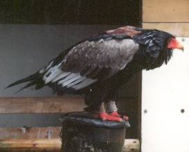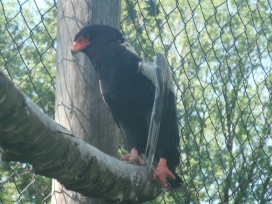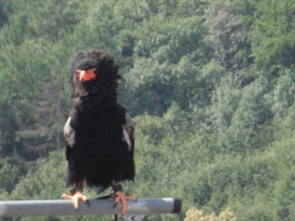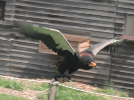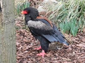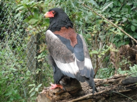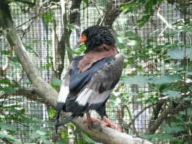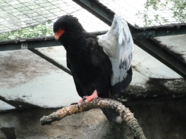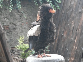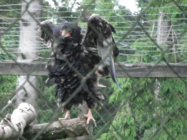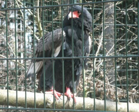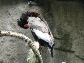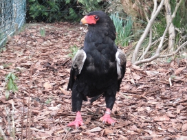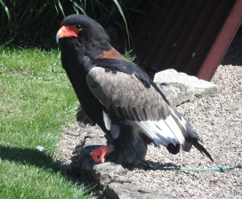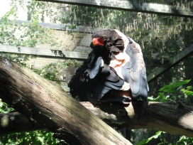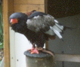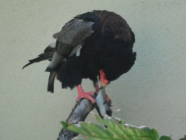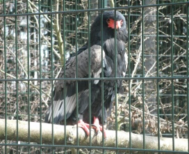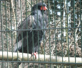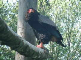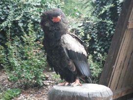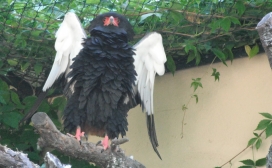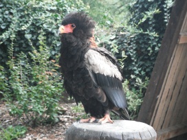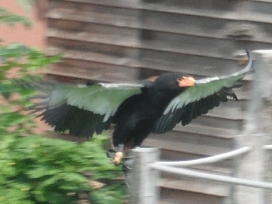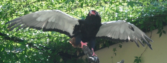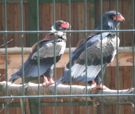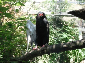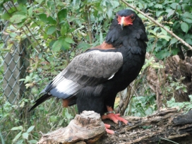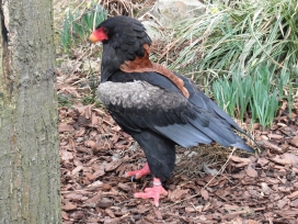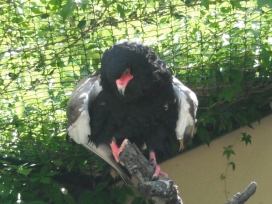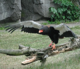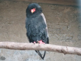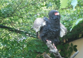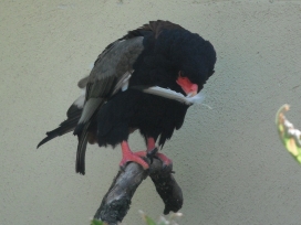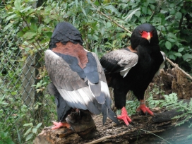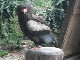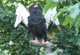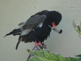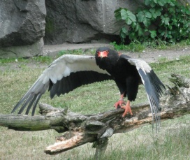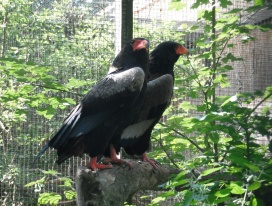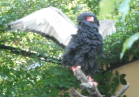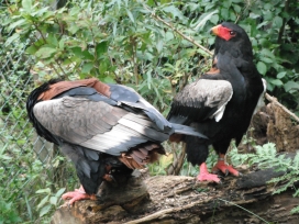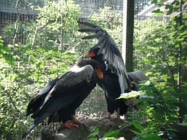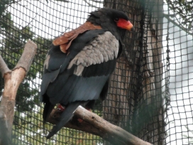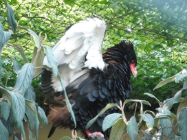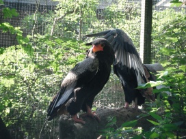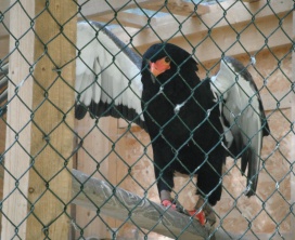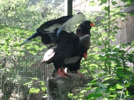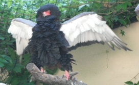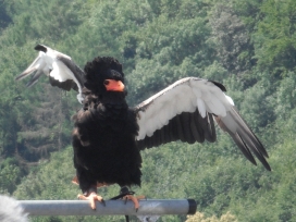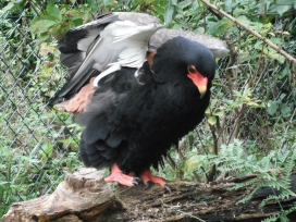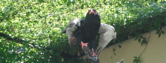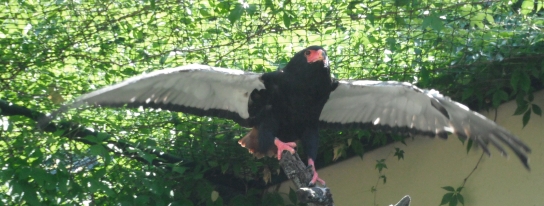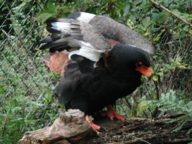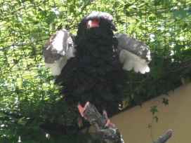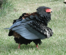 „Während der Balz plustert der Gaukler sein Gefieder auf, öffnet die Flügel und >verbeugt< sich vor seiner Partnerin“ (Zoo Schmiding: Zoo-Zooschild: Gaukler).