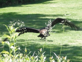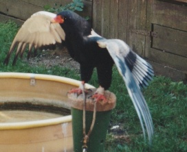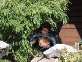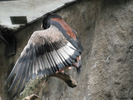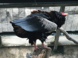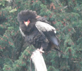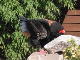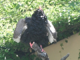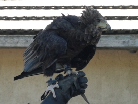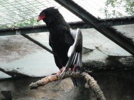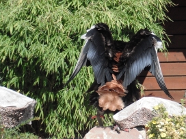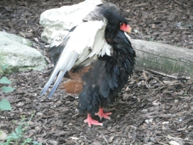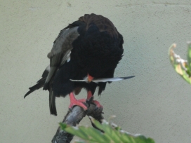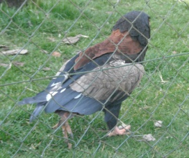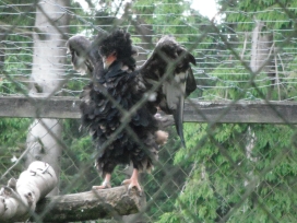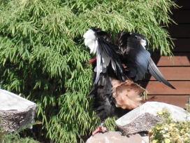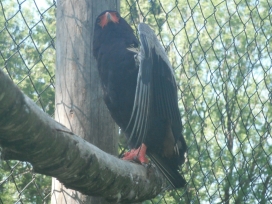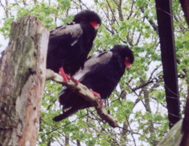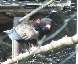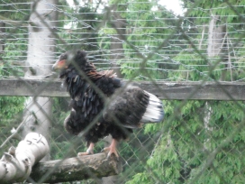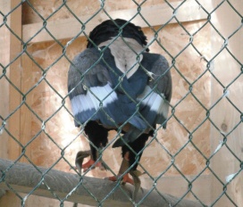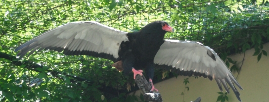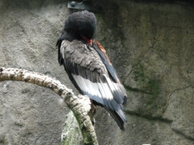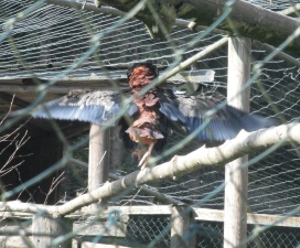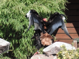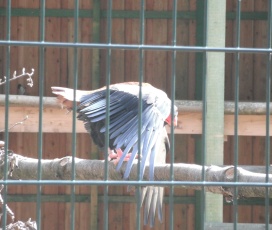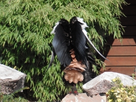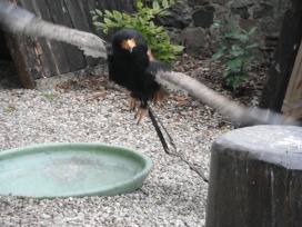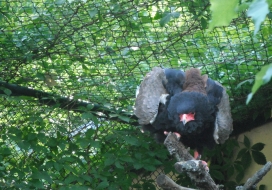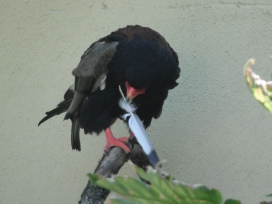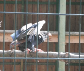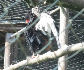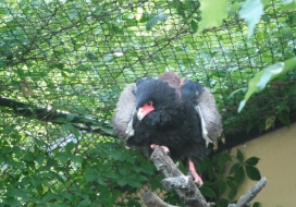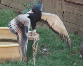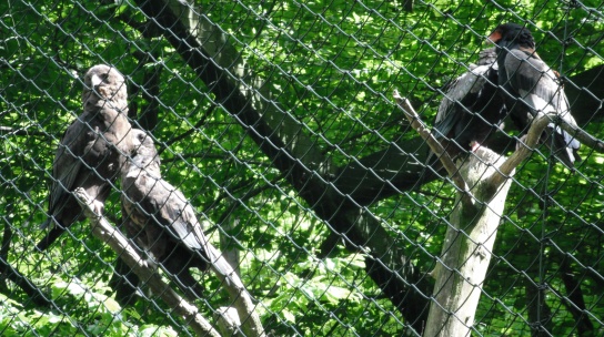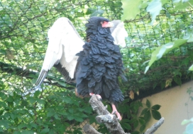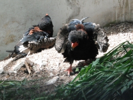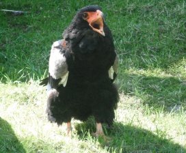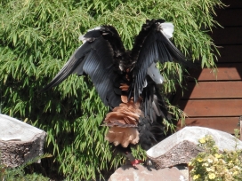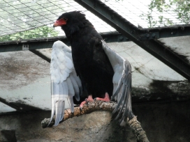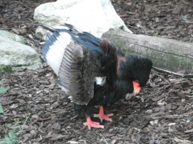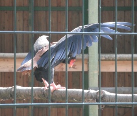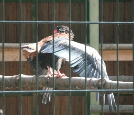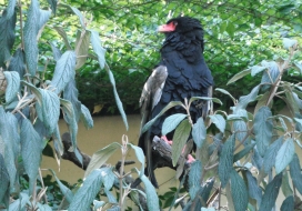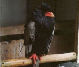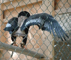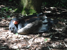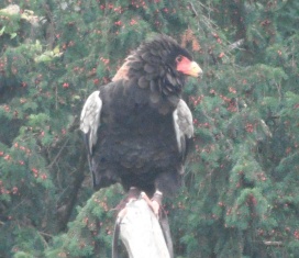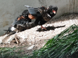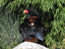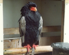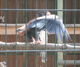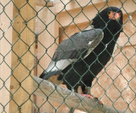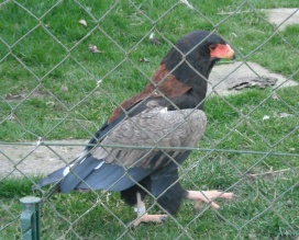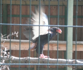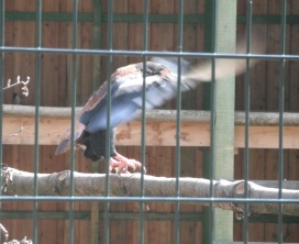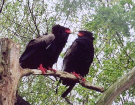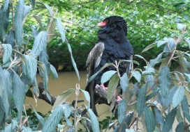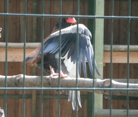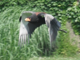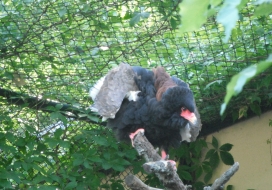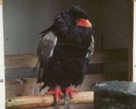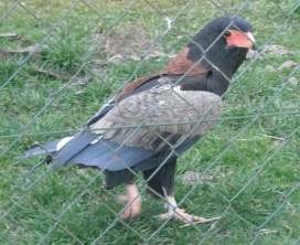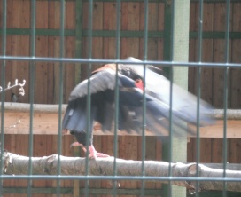 „Während der Balz plustert der Gaukler sein Gefieder auf, öffnet die Flügel und >verbeugt< sich vor seiner Partnerin“ (Zoo Schmiding: Zoo-Zooschild: Gaukler).