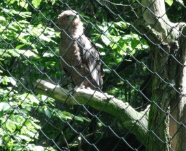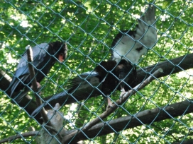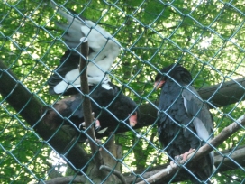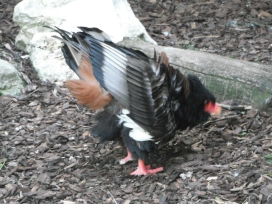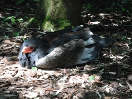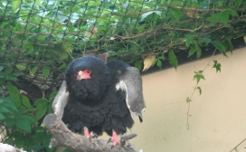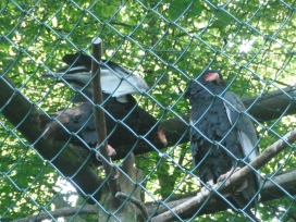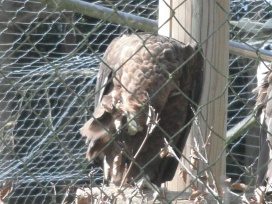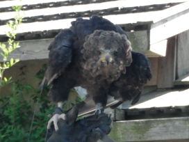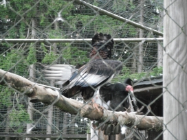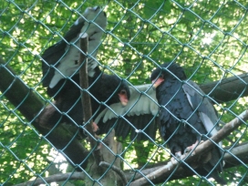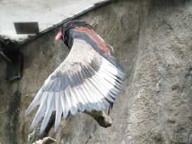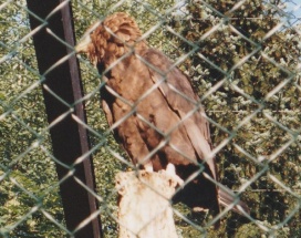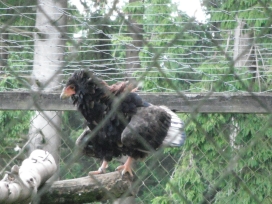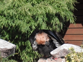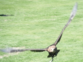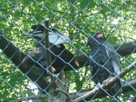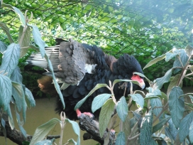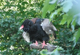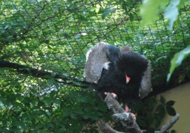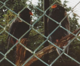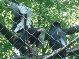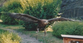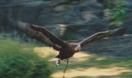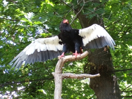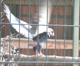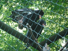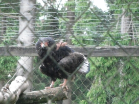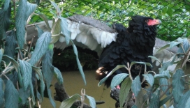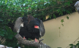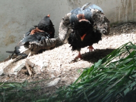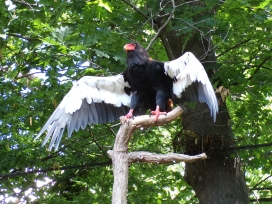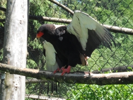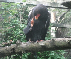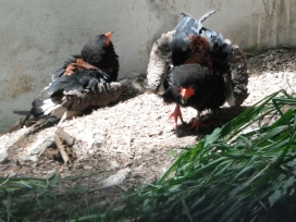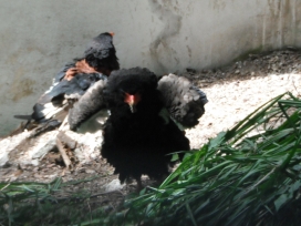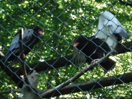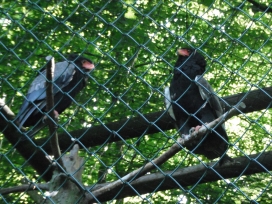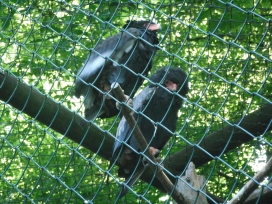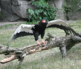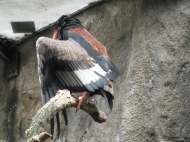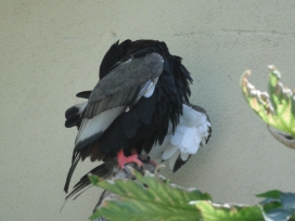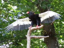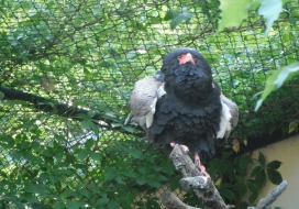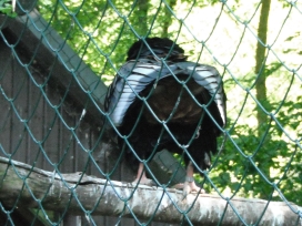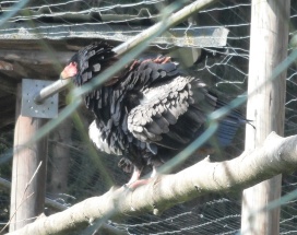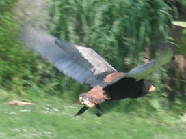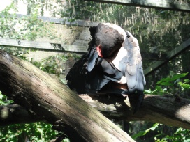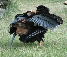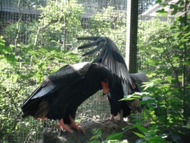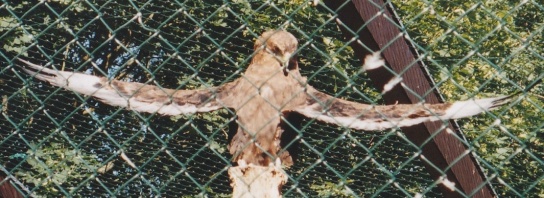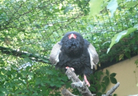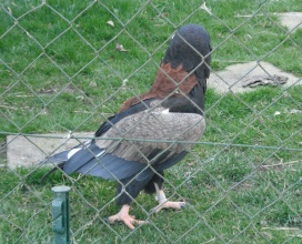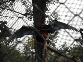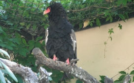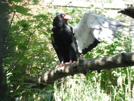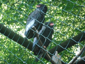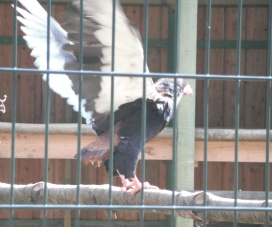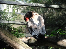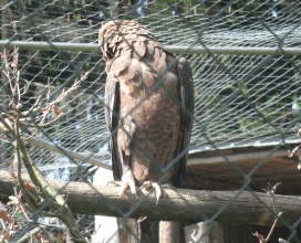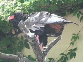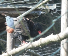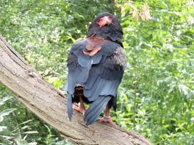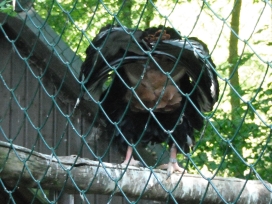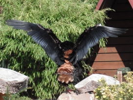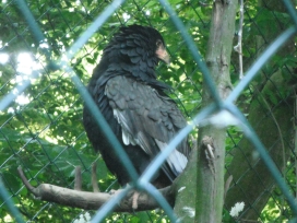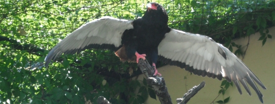 „Während der Balz plustert der Gaukler sein Gefieder auf, öffnet die Flügel und >verbeugt< sich vor seiner Partnerin“ (Zoo Schmiding: Zoo-Zooschild: Gaukler).