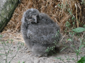 Die Jungvögel verlassen das Nest mit 2 bis 3 Wochen (FALKE 08/2016; VÖGEL 01/2017) oder mit 15 bis 20 Tagen (Thiede: „Greifvögel und Eulen“, 3.Aufl. (2005)) oder mit ca. 25 Tagen („Faszination Tier & Natur“ (Loseblatt-Sammelwerk)) oder mit 18 bis 28 Tagen (König/Weick: „Owls of the World“ (2008)) oder mit ca. 25 Tagen (Tiergarten Halberstadt: Zooschild) oder mit 3 bis 4 Wochen (Harrison: "Jungvögel, Eier und Nester" (1975)).