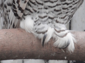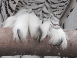 Die Beine und Zehen sind „mit Federn bedeckt“ („Tierparadiese unserer Erde: Polargebiete“ (2008)) oder die Beine und Zehen sind befiedert ("Wegweiser durch den Tiergarten Nürnberg" (2007; 2011; 2012/2013)) oder die Beine und Zehen sind dicht weiss befiedert („Grzimeks Tierleben, Enzyklopädie des Tierreichs“, Band 8 (Vögel 2); Mebs/Scherzinger: "Die Eulen Europas" (2000)) oder die Läufe und die Zehen sind sehr dicht befiedert („Brehms Neue Tierenzyklopädie“, Band 6 (Vögel 2)) oder die Zehen sind dicht befiedert ("Lebendige Wildnis, Tiere der Nadelwälder" (1994)) oder die Füsse sind „bis zu den Klauen befiedert“ (Gosler: „Die Vögel der Welt“) oder die Füsse sind dicht befiedert („Vögel, Die grosse Bild-Enzyklopädie“ (2007), was zum einen dem Schutz vor Kälte dient und zum anderen gegen ein übermässiges Einsinken im Schnee hilft ("Wegweiser durch den Tiergarten Nürnberg" (2007; 2011; 2012/2013)). Des Weiteren bietet diese Befiederung einen Schutz „vor den Bissen“ der Beutetiere („Tierparadiese unserer Erde: Polargebiete“ (2008)).