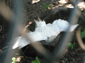 Der schwarze Schnabel steckt „bis zur Hälfte in dichten, weissen Federborsten“ („Brehms Neue Tierenzyklopädie“, Band 6 (Vögel 2)) oder „ist mit schneeweissen Federn bedeckt“ („Faszination Tier“ (1994)).