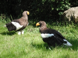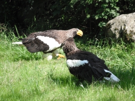 Der Tierpark Berlin (Friedrichsfelde) zeigt andererseits einen Altvogel der braunen Morphe (Dr. Blaszkiewitz: „Tierpark Berlin; Wegweiser durch den Tierpark“ 2013 (49.Auflage)), die einen weissen Schwanz und eine braune Stirn, braune Schultern und braune Hosen hat. Die entscheidende Antwort auf die Frage der Fragen, ob der Korea-Seeadler oder Schwarze Seeadler, lat. Haliaeetus pelagicus niger eine Unterart ist oder eine eigene Art ist, findet man in der Gefiederten Welt (07/2016), denn dort heisst es: „Seit über einem Jahrhundert lebten keine Tiere dieser Form in Menschenobhut und auch im Freiland erfolgten seit Jahrzehnten keine Beobachtungen (Kaiser 2010). Da die Eltern unseres aus dem Tiergarten Nürnberg stammenden Weibchens normal gefärbt sind, ist der Nachweis erbracht, dass es sich nicht um eine Art oder Unterart handelt, sondern um eine seltene Farbform, wie sie bei anderen Vogelarten auch vorkommt.“ Des Weiteren findet man zum Sachverhalt die Vorgeschichte. „Schon seit 1994 leben Riesenseeadler am Schmausenbuck, aber ein Jungvogel schlüpfte noch nicht“ und „sieht man einmal von jenem Einzelfall ab, als der Tiergarten von einem Jagdfalkenhof ein künstlich besamtes Ei bekam, welches die Pfleger dann einem Weisskopfseeadler-Paar unterjubelten“ und „die Weisskopfseeadler indes akzeptierten das >Kuckuckskind<, das nun im Tierpark Berlin lebt“ (Verein der Tiergartenfreunde Nürnberg e.V.: „Tiergartenzeitung“ 14 (04/2017)). Man findet auch, dass das betreffende Weibchen „bisher nur normal gefärbte Nachkommenschaft” grosszog (“Der Falkner” (2017)).