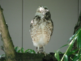 Die Unterseite ist auf der Brust und auf dem Bauch gestreift und gepunktet („Vögel, Die grosse Bild-Enzyklopädie“ (2007)) oder die Unterseite ist auf der „Brust braun mit weissen Flecken“, danach „weiss bis hellbraun mit dunkelbraunen Querstreifen“ („Washingtoner Artenschutzabkommen, Erkennungsbuch“ Band 3 (1993)) oder die Unterseite ist quergefleckt (Diesselhorst, Fechter: „Knaurs Tierleben von A-Z, Band 1 (A-L)”, 1981) oder die Unterseite ist auf der Oberbrust „von einer dunklen Linie durchzogen“, auf der Unterbrust und dem Bauch gebändert (Gosler: „Die Vögel der Welt“) oder die Unterseite ist „weiss mit braungrauen Schuppen“ ("Lebendige Wildnis, Tiere der Nadelwälder" (1994)) oder der Unterhals ist rötlichgelb, graubraun gefleckt, die Brust ist graubraun, gelblich gefleckt und der Unterbauch ist gelblichweiss (Smolik: „rororo Tierlexikon“: Band 3: Vögel; (1969)) oder die Unterseite ist cremefarben mit dunkelbraunem Kragen („Faszination Tier & Natur“ (Loseblatt-Sammelwerk)) oder die Unterseite ist weisslich bis blassbüffellederfarben und dunkelbraun quergestreift (König/Weick: „Owls of the World“ (2008)) oder weisslich bis mattgelb und dunkelbraun quergestreift (Mikkola: „Owls of the World“ (2012); Mikkola: „Handbuch Eulen der Welt“ (2013)).