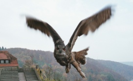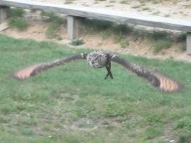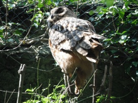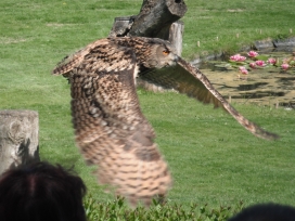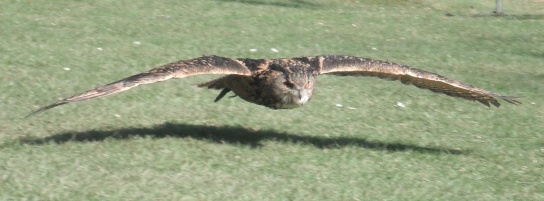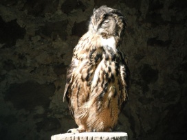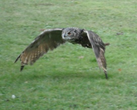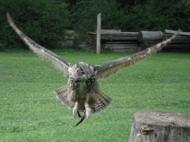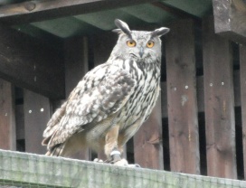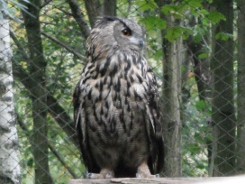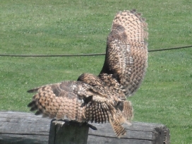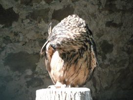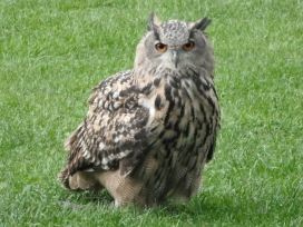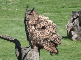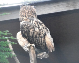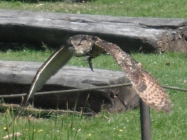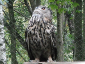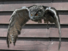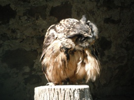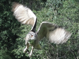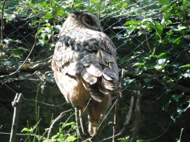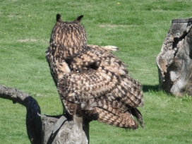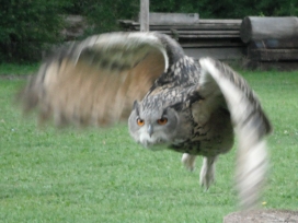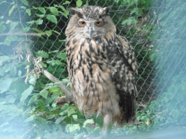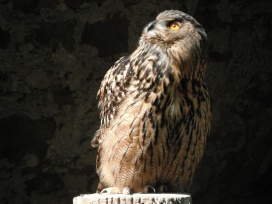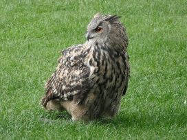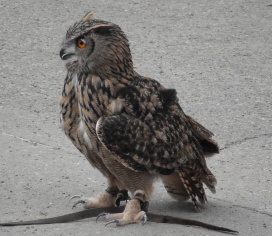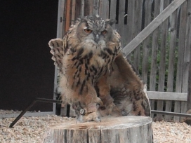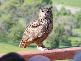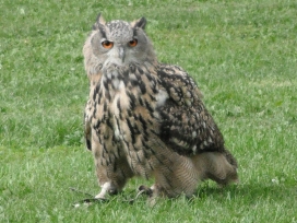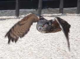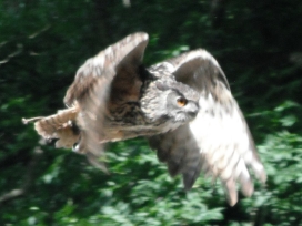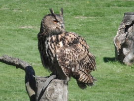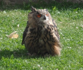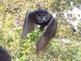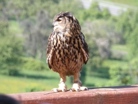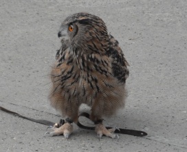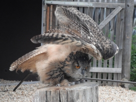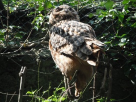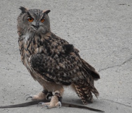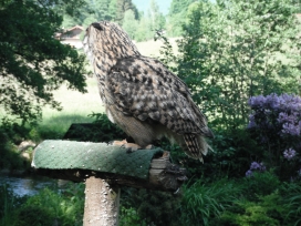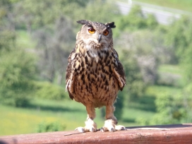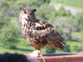 Die Uhus können den Kopf um 270° drehen (Falknerei Bergisch Land: Zooschild; Stadtwerke Bayreuth: „Für mein Leben“: Oktober 2018).