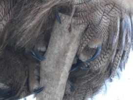 Die Beine und die Zehen sind befiedert (Robiller: „Lexikon der Vogelhaltung“ (1986)) oder die Läufe und die Zehen sind „hell gelborange befiedert“ („Washingtoner Artenschutzabkommen, Erkennungsbuch“ Band 3 (1993)).