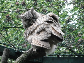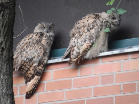 In den ersten 2 bis 3 Wochen beschafft das Männchen die Beute für das Weibchen und die Jungvögel (Tierpark Berlin Friedrichsfelde: Zooschild). Die jungen Uhus sind nach zwei Monaten flügge (Tierpark Berlin Friedrichsfelde: Zooschild). Die Elternvögel betreuen die jungen Uhus noch weitere 5 Monate.
